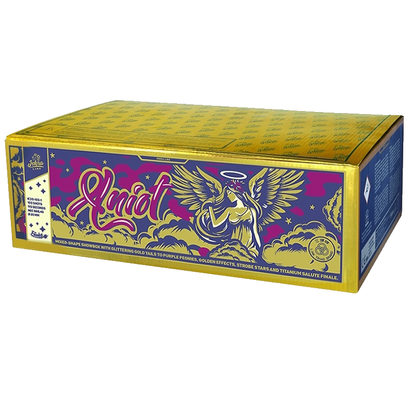 Showbox mit gemischter Fächerung aus blinkenden Goldschweifaufstiegen zu Goldeffekten mit purpurnen Sternen und Blinkern sowie Titansalut-Finale
